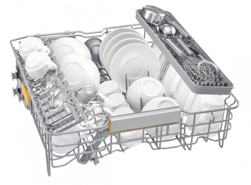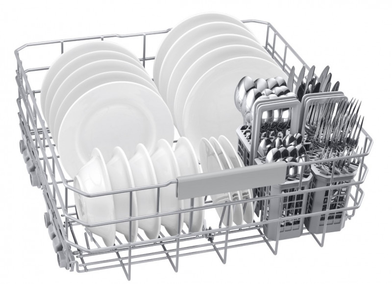Підходить для посуду, склянок і чашок різних розмірів. Середню полицю можна регулювати за допомогою важеля в 3 положеннях, вона також має тримач для склянок. Висока нижня полиця зі складеними вперед зубцями допомагає надійно розмістити тарілки й миски, а зубці ззаду повністю складаються, щоб можна було розмістити великі предмети.
