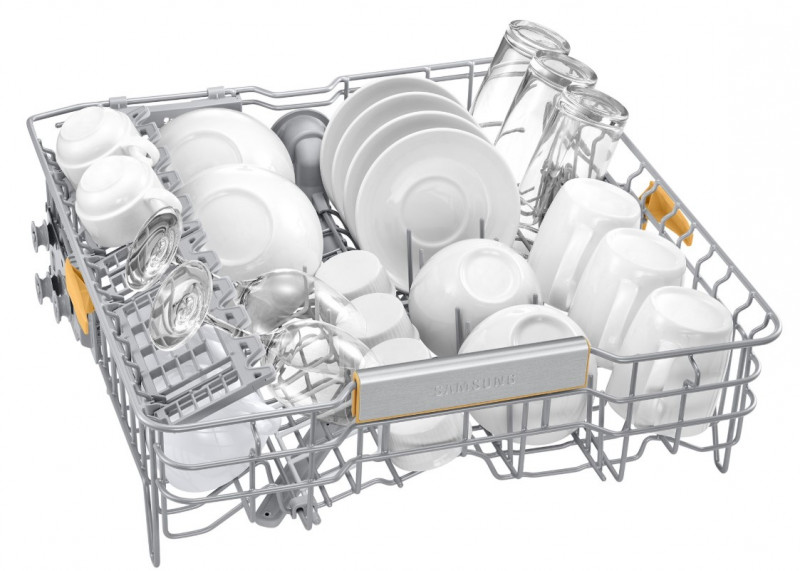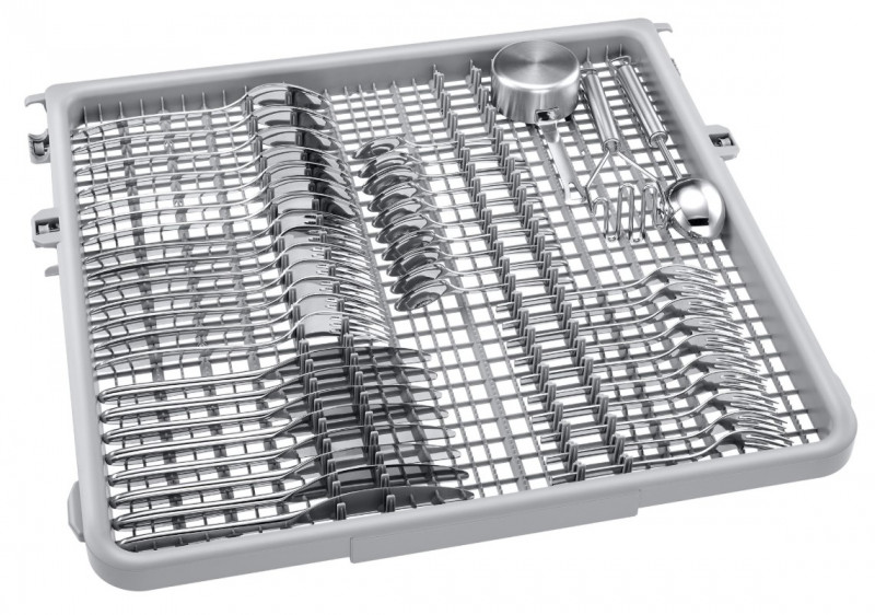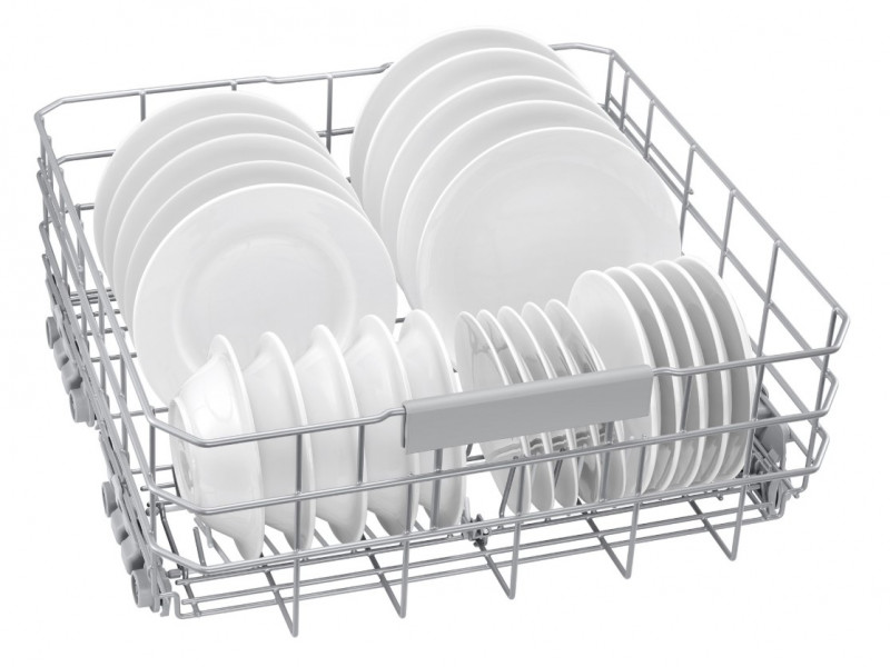 Підходить для посуду, склянок і чашок різних розмірів. Середню полицю можна регулювати за допомогою важеля в 3 положеннях, вона також має тримач для склянок. Висока нижня полиця зі складеними вперед зубцями допомагає надійно розмістити тарілки й миски, а зубці ззаду повністю складаються, щоб можна було розмістити великі предмети.