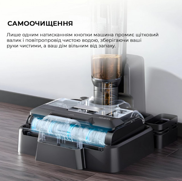 Наприкінці вологого прибирання все, що вам потрібно зробити, - це встановити пилосос на станцію зберігання та зарядки і включити режим самоочищення. Після чого розпочнеться спеціальна процедура, в ході якої пилосос самостійно очистить миючий валик від бруду, промиє його чистою водою та очистить від зайвої вологи. Така система дозволяє безконтактно промивати ролик після прибирання та зберігати пристрій у чистоті мінімізуючи ризики утворення неприємних запахів та іншого.