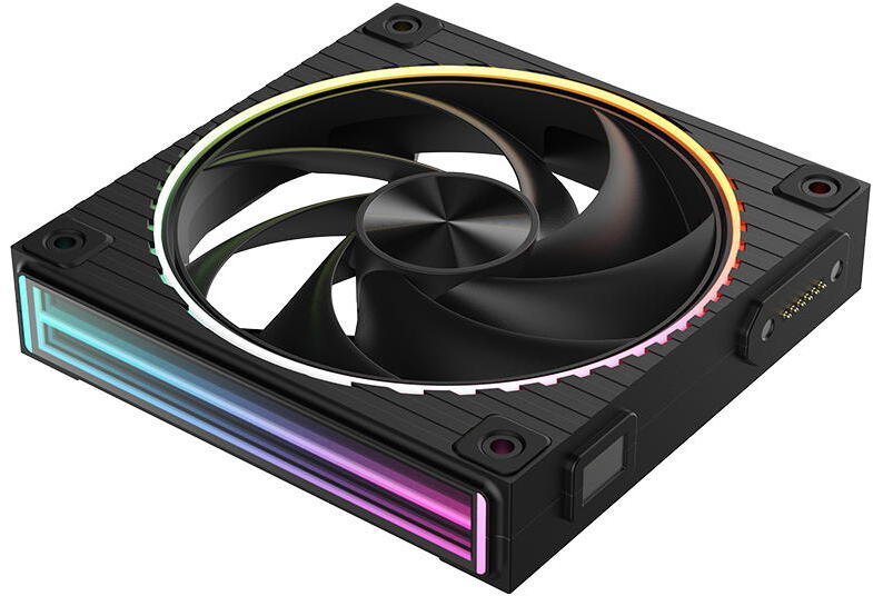 Лопаті вентилятора з'єднані суцільним кільцевим обідком — конструкція, запозичена з авіаційних газових турбін. Обідок запобігає відцентровому витоку повітря по краях лопатей, усуває завихрення та зворотні потоки, мінімізує вібрацію лопатей під час роботи. Результат — максимальний потік повітря 70,1 CFM і статичний тиск 2,13 мм вод. ст. при максимальних 2 300 об/хв — дуже серйозні показники для 120-мм вентилятора. Це версія з реверсним напрямком обертання, що дозволяє гнучко розміщувати вентилятор у різних конфігураціях продування корпусу.
