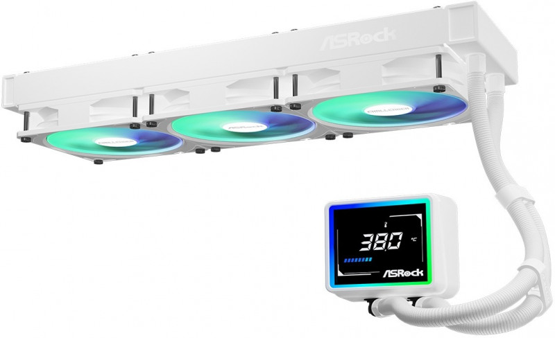 Система рідинного охолодження ASRock Challenger 360 Digital є сучасним AIO-рішенням, яке поєднує високу ефективність охолодження з привабливим цифровим дизайном. Радіатор розміром 360 мм забезпечує велику площу розсіювання тепла, що дозволяє ефективно справлятися з гарячими сучасними процесорами. Три 120-міліметрові вентилятори з оптимізованими лопатями створюють потужний повітряний потік при відносно низькому рівні шуму, а водоблок із вбудованою помпою має покращену конструкцію для швидкого відводу тепла від CPU.