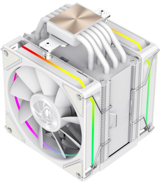 Вентилятори працюють у режимі PWM зі швидкістю від 800 до 1800 обертів за хвилину, забезпечуючи високий повітряний потік до 71,66 CFM. Один вентилятор має прямі лопаті, а другий — зворотні для оптимального охолодження. Рівень шуму не перевищує 42 дБА, а ARGB-підсвітка з 28 світлодіодами синхронізується з материнськими платами популярних брендів.