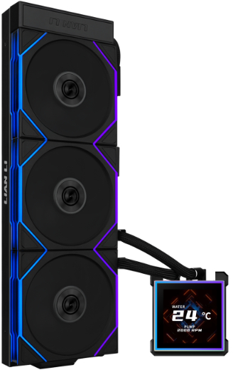 Помпа в цій системі суттєво покращена — вона працює в діапазоні до 3200 об/хв при дуже низькому рівні шуму (≤28 дБА), що гарантує ефективне охолодження навіть для потужних процесорів. Дисплей кріпиться магнітно з можливістю гарячої заміни через pogo-pin-конектори, тому його можна встановлювати вже після збирання системи без відключення живлення. Підтримуються три режими керування через L-Connect 3: офлайн (без підключення), бездротовий (через L-Wireless Controller) та повноцінний USB-стримінг для максимальної кастомізації.