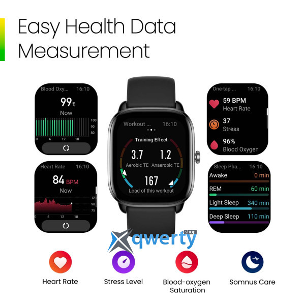 Используйте смарт-часы Amazfit GTS 4 Mini, чтобы получать комплексную информацию о самых разных физических показателях. (7) В частности, они предлагают круглосуточный мониторинг (8) частоты сердцебиения, уровня насыщения крови кислородом (SpO2) и уровня стресса.