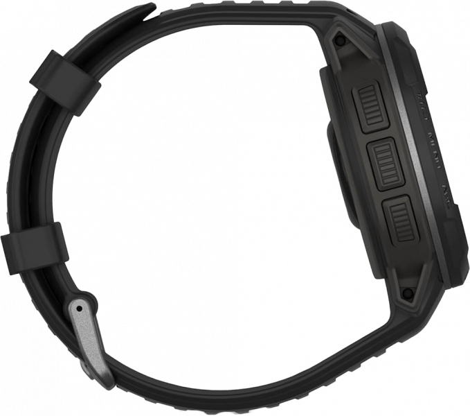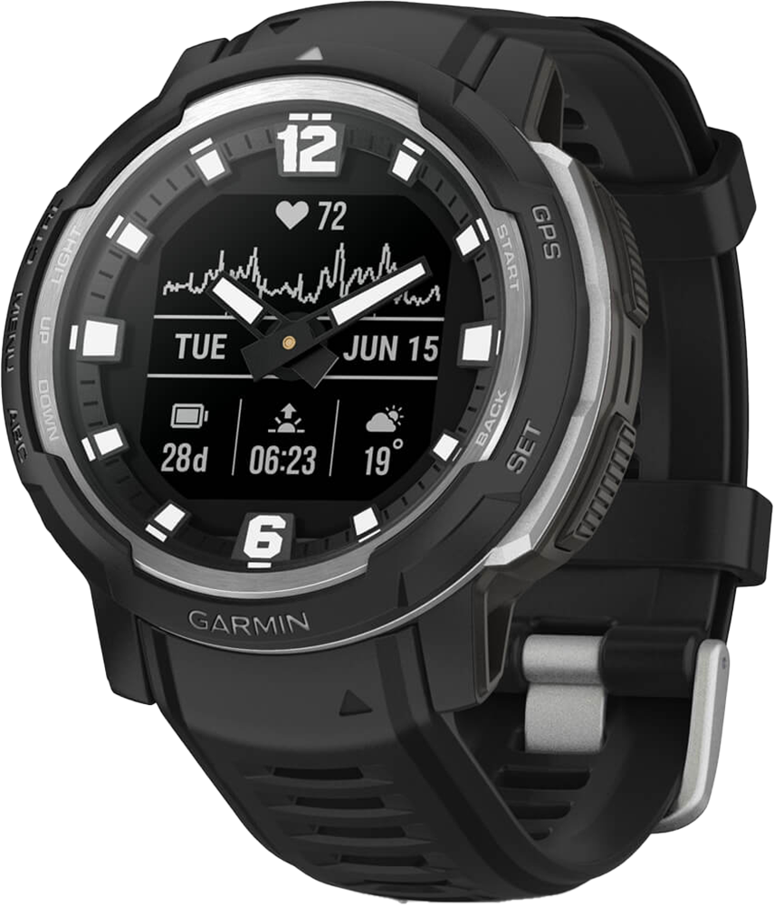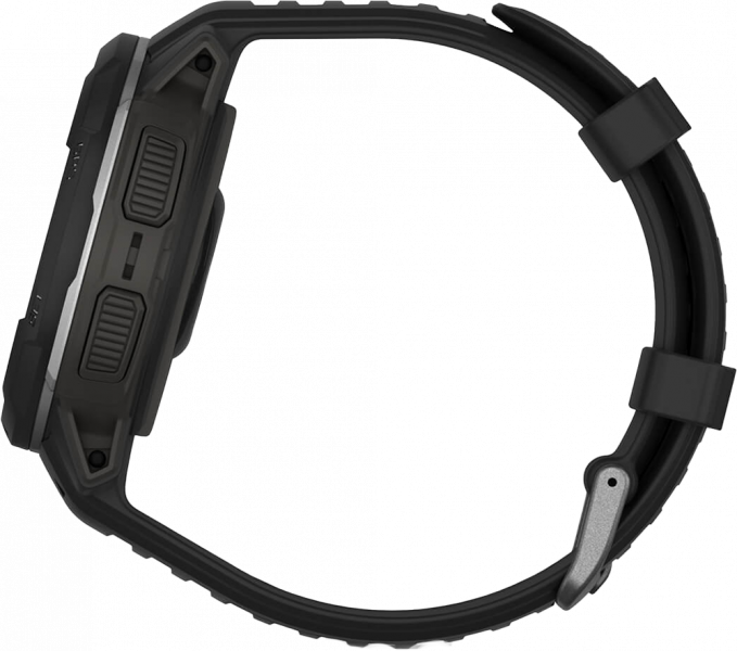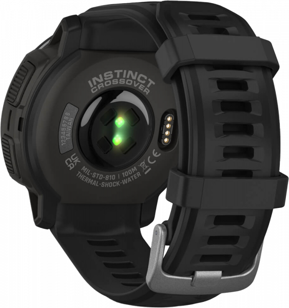 Эта модель Garmin Instinct Crossover оснащена армированным черным волокном полимерным корпусом с черным силиконовым ремешком, двухуровневым безелем и стрелками с самоподсветкой.