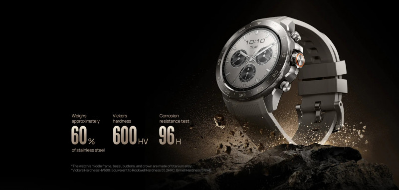 Корпус смарт-годинника виготовлено з титану aerospace-grade, посиленого полімером і захищеного склом Corning Gorilla Glass, що дозволяє витримувати екстремальні умови, включаючи удари, вібрацію та соляний туман. Захист 10 ATM забезпечує водонепроникність до 100 м, з підтримкою режиму фрідайвінгу до 30 м, де відстежуються глибина, швидкість занурення та час. Дисплей AMOLED з високою яскравістю та щільністю пікселів гарантує чітке зображення навіть під прямим сонцем, з функцією постійного відображення.