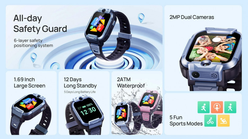 Годинник підтримує двосторонній голосовий зв’язок і відеодзвінки через Nano-SIM. Дві камери по 2 МП — фронтальна для селфі та висувна основна — дають змогу робити знімки та вести відеорозмови. Акселерометр BOSCH-BMA422 відстежує рухи, підтримує базові спортивні режими та крокомір.