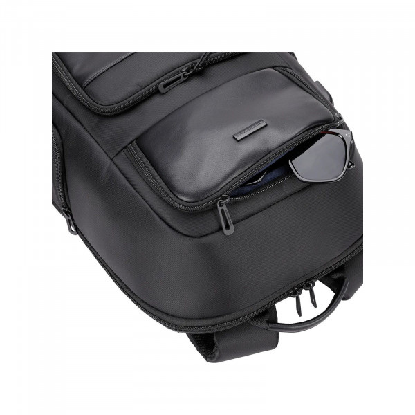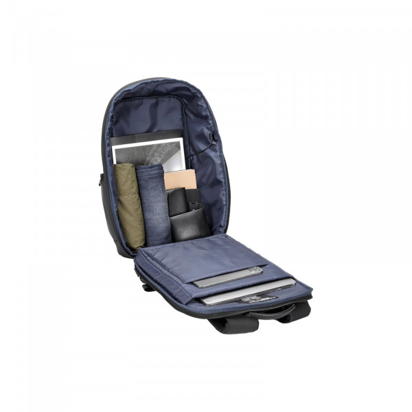 Рюкзак виготовлений з міцного матеріалу — поліестеру та еко-шкіри. Внутрішня конструкція рюкзака оптимізована для максимальної зручності. Основне відділення має спеціальне відділення для ноутбука розміром 15.6", а також чотири кишені для документів, аксесуарів, блокнотів. Практичний доступ до основного відділення забезпечує оптимальну зручність витягування вмісту.