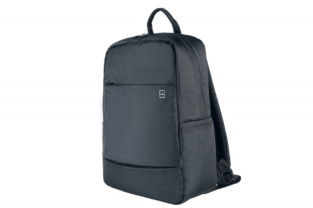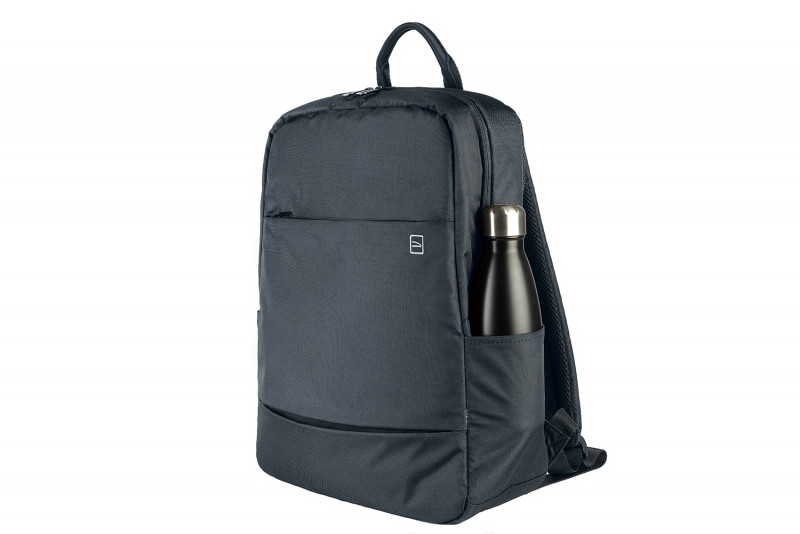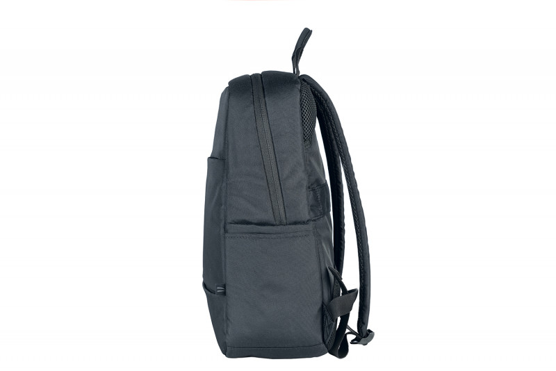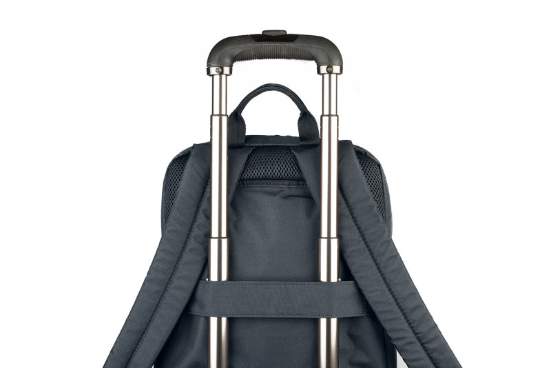 Рюкзак має ремінь для кріплення на ручці валізи. М’яке внутрішнє відділення захищає ноутбук. Передня кишеня-органайзер на блискавці дозволяє зручно розмістити дрібні аксесуари. Усередині є сітчаста кишеня для аксесуарів. Бічні кишені підійдуть для пляшки води або парасольки. Рюкзак пошитий із тканини з переробленого пластику, що додає міцності та екологічності.