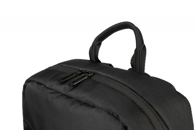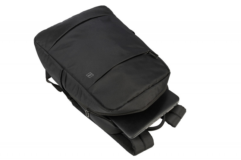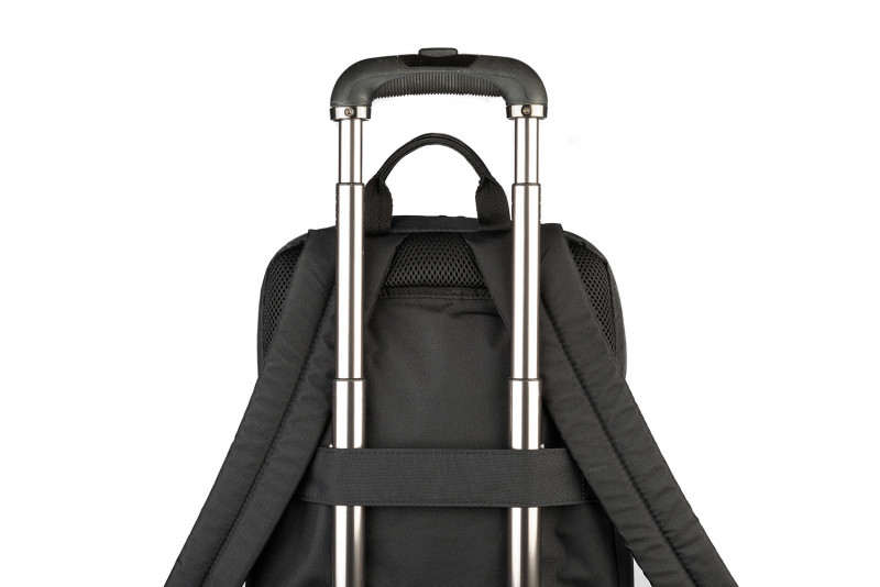 Рюкзак має ремінь для кріплення на ручці валізи. М’яке внутрішнє відділення захищає ноутбук. Передня кишеня-органайзер на блискавці дозволяє зручно розмістити дрібні аксесуари. Усередині є сітчаста кишеня для аксесуарів. Бічні кишені підійдуть для пляшки води або парасольки. Рюкзак пошитий із тканини з переробленого пластику, що додає міцності та екологічності.