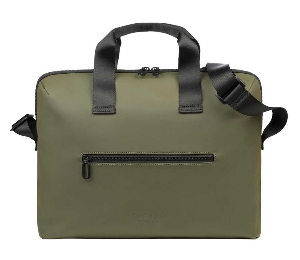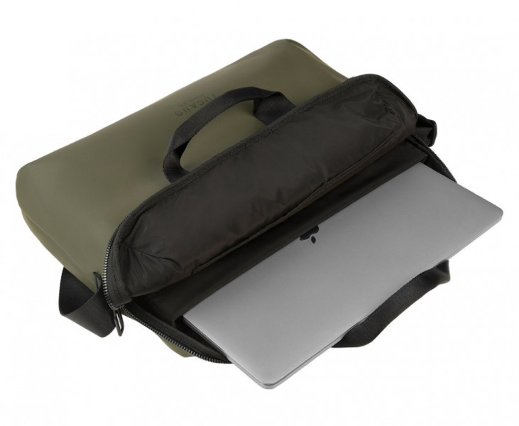 Сумка оснащена внутрішньою захисною кишенею для техніки до 16". Має зовнішню кишеню з блискавкою для аксесуарів. Плечовий ремінь регулюється та залишається незнімним. Великі розміри внутрішнього простору допомагають компактно розмістити повсякденні речі. Прогумована тканина формує стійку до зношування поверхню.