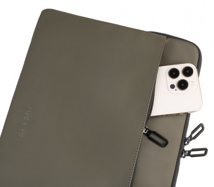 Водонепроникний чохол із прогумованого матеріалу Tucano Gommo для MacBook Pro 16" або для ноутбуків 16". Він має одне м’яке відділення з вбудованими неопреновими кутовими клапанами, які призначені для захисту кутів ноутбука, а також зручну зовнішню кишеню для аксесуарів на блискавці.