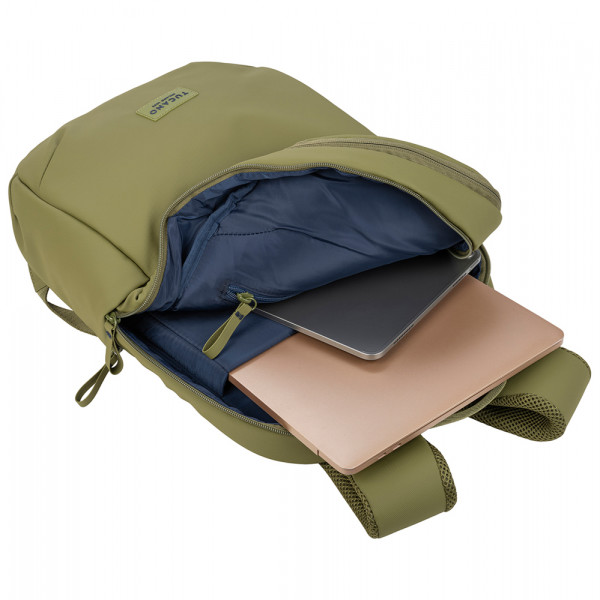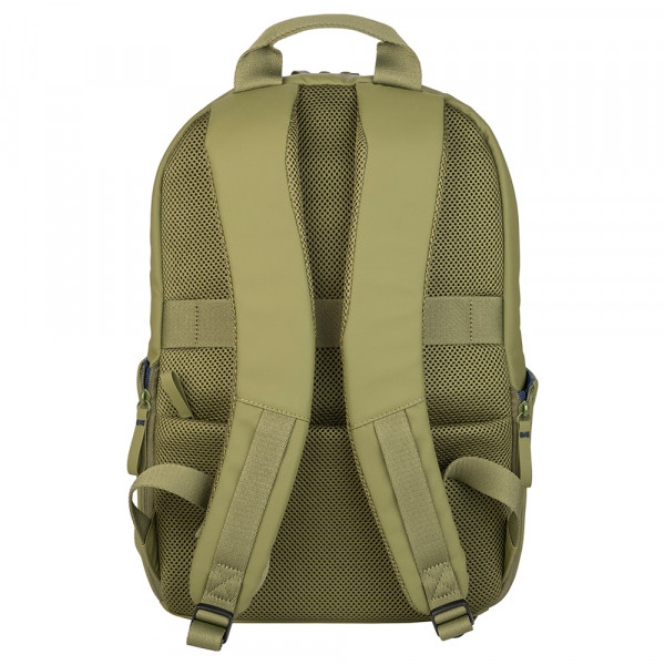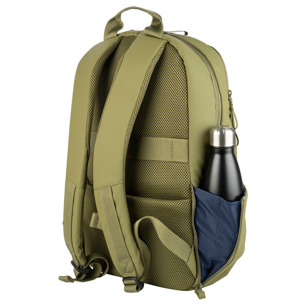 Рюкзак має спеціальну внутрішню кишеню для ноутбука. Передня кишеня-органайзер дозволяє зручно зберігати дрібні речі. Задня панель і ремінці ергономічно м’які для комфорту під час тривалого носіння. Захисна кишеня на спині оберігає гаджети від пошкоджень. Основне відділення рюкзака містке і зручно організоване. Водостійка перероблена тканина з покриттям забезпечує надійний захист від вологи, а ремінець на ручці валізи додає зручності під час подорожей.