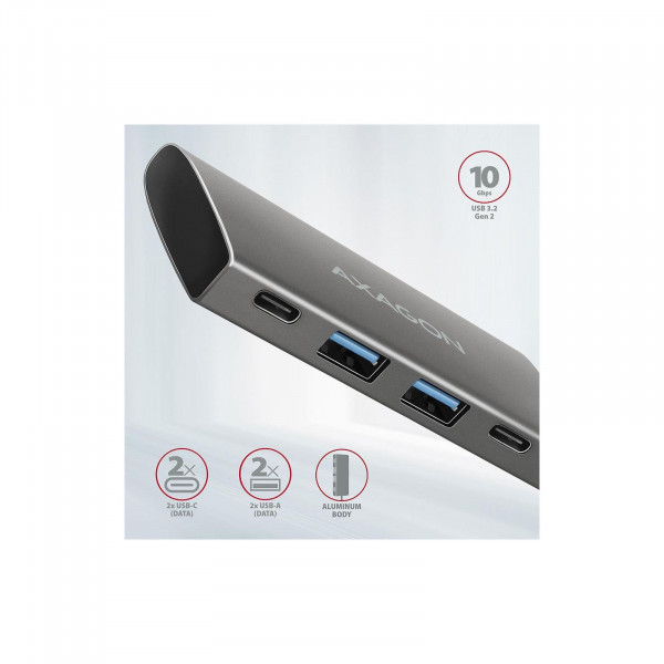 AXAGON HMC-4G2 — це універсальний концентратор USB-C 3.2 Gen 2, який розширює можливості ноутбуків, ПК або смартфонів, додаючи чотири додаткові порти для підключення периферійних пристроїв. Його конструкція поєднує сучасний дизайн, високу швидкість передачі даних до 10 Гбіт/с і стабільну роботу навіть при підключенні декількох пристроїв одночасно.