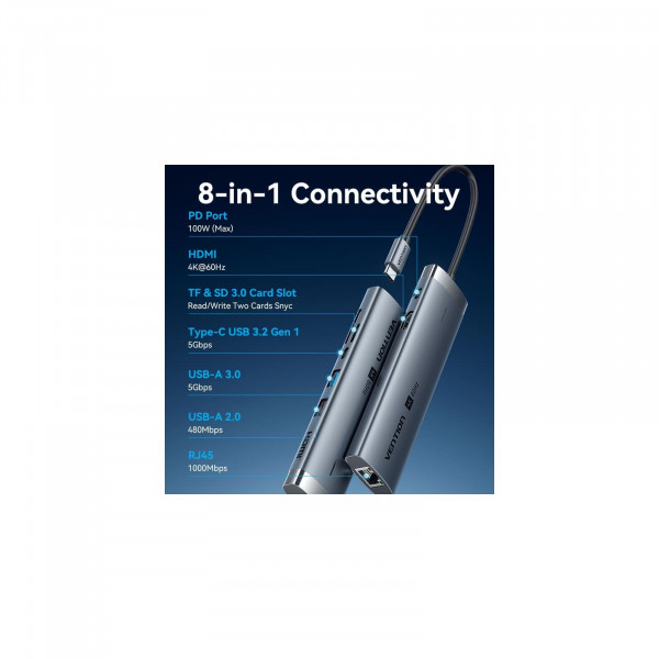Концентратор VENTION USB-C 7-in-1 — це універсальний та компактний пристрій, що значно розширить можливості вашого ноутбука або планшета. Підключаючись через USB Type-C інтерфейс, цей концентратор надає цілий спектр вихідних роз'ємів для зручності підключення. Серед них — 1 x USB 3.0, 1 x USB 2.0, 1 x USB Type-C, RJ45 для підключення до дротових мереж, а також слоти для microSD та SD карт, що дозволяє читати дані з великою швидкістю.