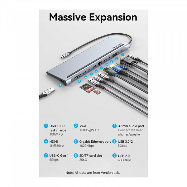 Отзывы о Vention USB3.1 Type-C to HDMI/VGA/USB-C/USB3.0x3/RJ45/SD/TF/TRRS 3.5mm/PD 100W 11in1 (THTHC)