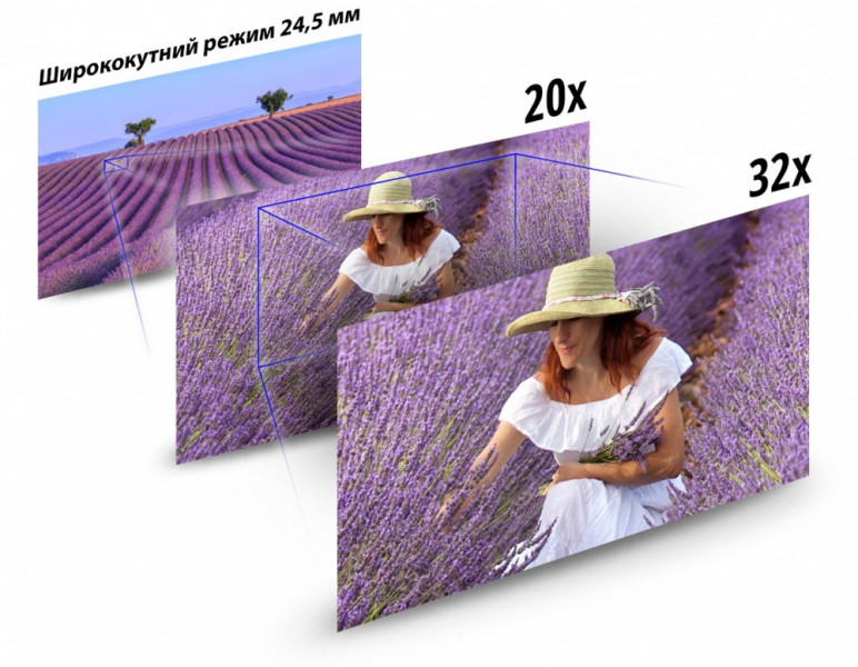 Об’єктив охоплює діапазон фокусних відстаней від ширококутного режиму 24,5 мм до режиму телефото 490 мм із 20-кратним масштабуванням. i.ZOOM досягає 24-кратного масштабування з роздільною здатністю 4K та 32-кратного масштабування з роздільною здатністю FHD.