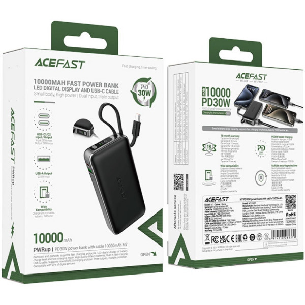 Внешний аккумулятор ACEFAST M7 с встроенным USB-C кабелем будет поддерживать плавную работу ваших устройств, где бы вы ни находились. Элегантный корпус из поликарбоната не только придает стильный вид, но и обладает огнестойкими свойствами, что делает его надежным и безопасным. Емкость 10000 мАч обеспечивает многократную зарядку ваших устройств без необходимости частой подзарядки самой батареи. Цифровой светодиодный дисплей позволяет легко контролировать уровень заряда, а специальный индикатор указывает на активность режима быстрой зарядки. Благодаря поддержке протоколов быстрой зарядки PPS/PD2.0/PD3.0/QC4 +/QC3.0/QC2.0/AFC/FCP/SCP, этот аккумулятор становится универсальным решением для любого пользователя. Его компактный размер и легкий вес делают его удобным для повседневного использования и переноски. Аккумулятор ACEFAST M7 станет незаменимым помощником для всех, кто ценит надежность и удобство в повседневной жизни