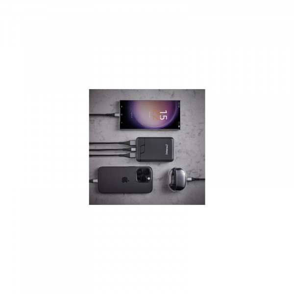 Intenso Powerbank B10000 оснащений сучасним літій-полімерним акумулятором і кількома універсальними портами: USB-C із функцією введення та виведення енергії, а також двома виходами USB-A. Це дає змогу одночасно підзаряджати кілька пристроїв — наприклад смартфон і навушники — без втрати потужності. Струм заряджання до 2,4 А гарантує стабільну роботу навіть при використанні з потужними гаджетами. Чотири вбудовані світлодіодні індикатори точно показують рівень заряду, що дає змогу контролювати залишкову енергію під час поїздок чи роботи поза домом.