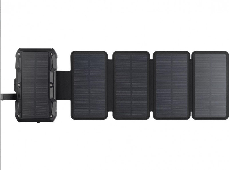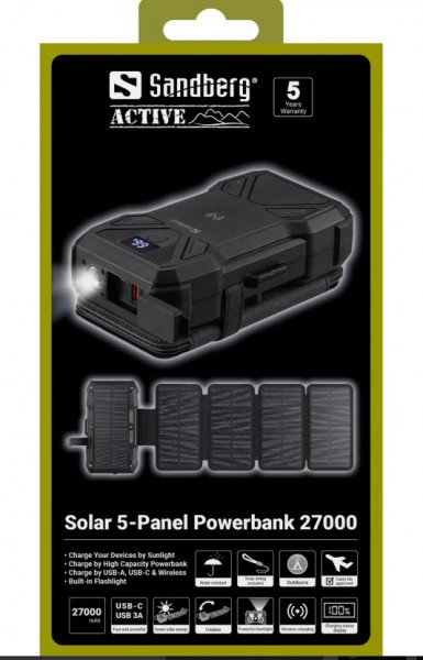 Універсальна мобільна батарея з п'ятьма сонячними панелями Sandberg Solar 5-Panel Powerbank 27000 mAh вирішить питання поповнення заряду USB-пристроїв в будь-яких умовах. Місткості 27000 достатньо для тривалої автономної роботи. УМБ оснащений трьома вихідними портами – двома портами USB Type-А, кожен із яких підтримує потужність до 22,5 Вт, портом USB Type-С PD20W та бездротовим зарядним пристроєм Qi з потужністю до 15 Вт. З її допомогою можна одночасно заряджати кілька пристроїв з потужністю до 15 Вт. Поповнюйте заряд УМБ, використовуючи порт USB Type-C, що працює із вхідною потужністю 18 Вт, або сонячні панелі, що заряджають УМБ із потужністю 8 Вт. На передній панелі світлодіодний дисплей надаватиме інформацію про поточний рівень заряду батареї. Вбудований ліхтарик із трьома режимами роботи дозволить зорієнтуватися у темряві та легко підключити необхідне обладнання. Sandberg Solar 5-Panel Powerbank 27000 mAh виготовлена в міцному, захищеному від негативного впливу води корпусі, тому ідеально підходить для використання в польових умовах. Беріть Sandberg 27000mAh Saver 22,5W на борт літака, вона відповідає стандартним вимогам авіакомпаній до розміру чи безпеки.