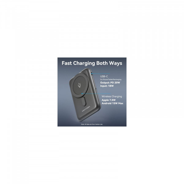 Універсальна мобільна батарея Vention Magnetic Wireless 10000mAh 20W PD є ідеальним рішенням для тих, хто шукає потужність, надійність і комфорт. Завдяки великій ємності в 10000 mAh ця батарея забезпечить тривалу підтримку заряду для ваших пристроїв, будь то смартфони, планшети, смарт-годинники чи навіть роутери.