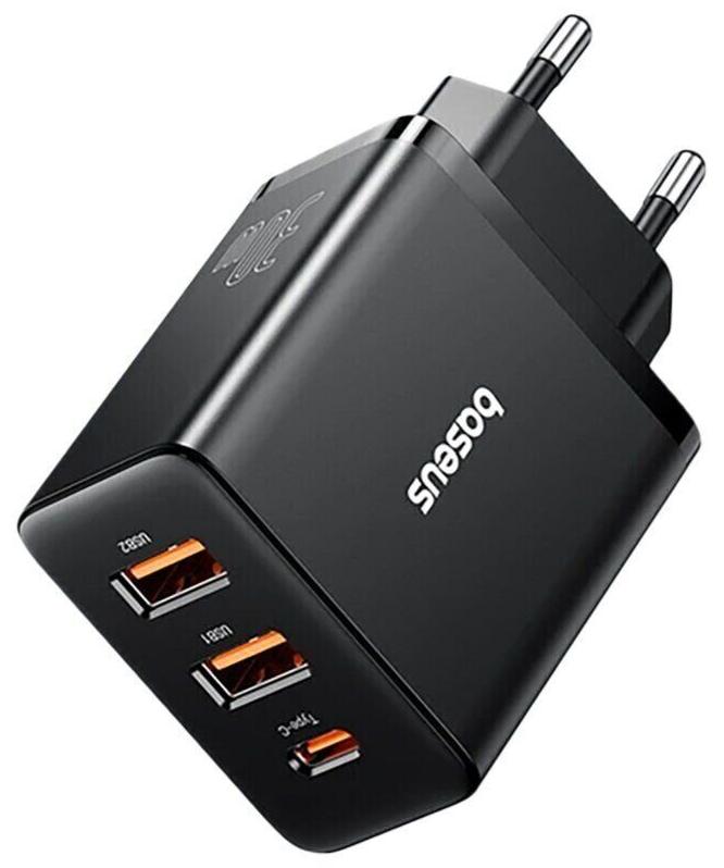 Мережевий зарядний пристрій від Baseus призначений для зарядки ґаджетів від мережі змінного струму. Поставляється без кабелю. Обладнаний двома портами USB Type-A та одним роз'ємом USB Type-C, що мають загальну потужність 30 Вт, підтримують протокол швидкої зарядки QuickCharge та дозволяють заряджати одразу три різних пристрої.