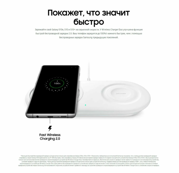 * Функція швидкого бездротового заряджання Fast Wireless Charging 2.0 доступна тільки для низки смартфонів Samsung, включно з Galaxy S10e, S10, S10 +, Note10, Note10 +. Результати лабораторних випробувань Samsung показали, що за допомогою цієї бездротової зарядки смартфони серії Galaxy S10 заряджаються на 27-36% швидше, ніж смартфони Galaxy S9. Фактичний час заряджання залежить від моделі конкретного мобільного пристрою, розміщеного на бездротовому зарядному пристрої. Функція доступна тільки у разі використання бездротового мультизарядного пристрою Wireless Charger Duo. Можна придбати додатково. Фактична швидкість заряджання також залежить від реального використання пристрою, умов заряджання та інших чинників.