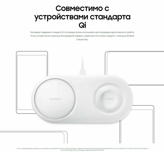 * Сумісно тільки зі смартфонами Samsung та інших виробників, сертифікованими за стандартом Qi, включно з Galaxy Note10, Note10 +, S10e, S10, S10 +, S9, S9 +, S8, S8 +, S8 Active, S7, S7 edge, S7 Active, S6, S6 edge, S6 Active, S6 edge +, Note9, Note8 і Note5.